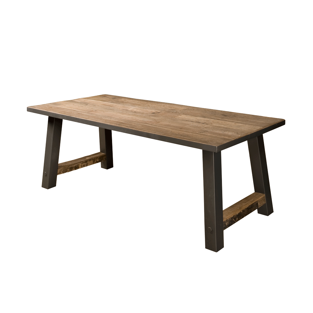 Der Esstisch und der Couchtisch Nano sind aus gemischtem und recyceltem Teakholz hergestellt, das aus alten Fußboden stammt. Die Tischplatten sind mit einem Mattlack veredelt. Die Kombination aus altem Holz, dem Metallbein und dem Metallrahmen verleiht diesem Tisch einen coolen und robusten Look.