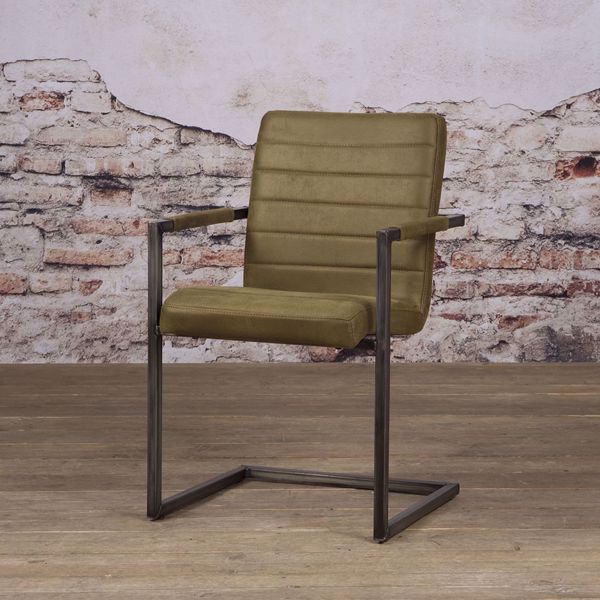 Ein bequemer Design Stuhl mit Armlehnen im Industrie Style. Ein schöner Stuhl mit einem Metallgestell. Den Stuhl gibt es wahlweise in verschiedenen Kunstlederfarben. Das Vintage Kunstleder und das kalte Metallgestell ergänzen sich ideal. Robust, dick und extrem belastbar, ist pflegeleicht und griffig und lässt sich problemlos feucht abwischen. Sie werden Ihre Freude an diesem schönen Industrie-Design Stuhl haben.. Die Abmessungen: ca.: Höhe 88 cm - Breite 52 cm - Tiefe 61 cm. Sitzhöhe: 51 cm Sitztiefe: 44 cm Armhöhe: 67 Montiert: teilweise montiert Gewicht: 12 kg Metallgestell strapazierfähiger Stoff 1 Paket