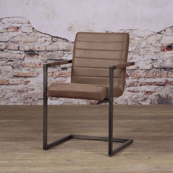 Ein bequemer Design Stuhl mit Armlehnen im Industrie Style. Ein schöner Stuhl mit einem Metallgestell. Den Stuhl gibt es wahlweise in verschiedenen Kunstlederfarben. Das Vintage Kunstleder und das kalte Metallgestell ergänzen sich ideal. Robust, dick und extrem belastbar, ist pflegeleicht und griffig und lässt sich problemlos feucht abwischen. Sie werden Ihre Freude an diesem schönen Industrie-Design Stuhl haben.. Die Abmessungen: ca.: Höhe 88 cm - Breite 52 cm - Tiefe 61 cm. Sitzhöhe: 51 cm Sitztiefe: 44 cm Armhöhe: 67 Montiert: teilweise montiert Gewicht: 12 kg Metallgestell strapazierfähiger Stoff 1 Paket