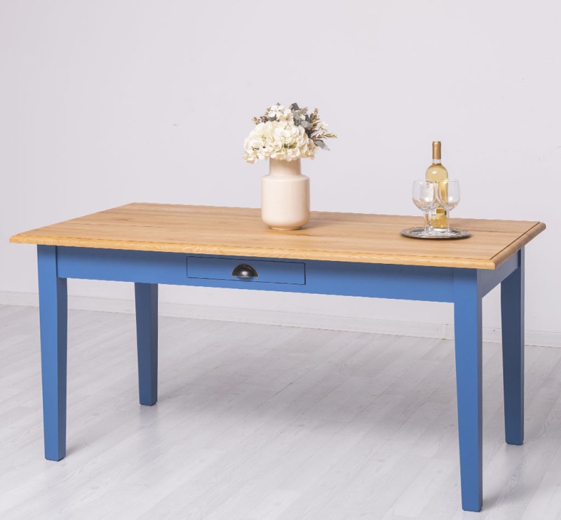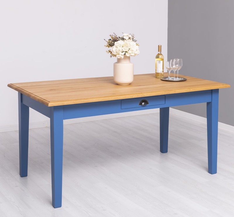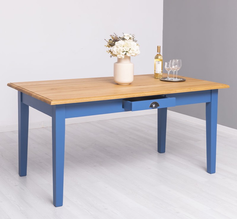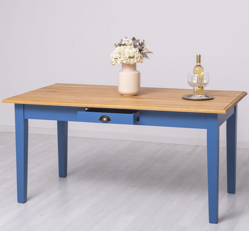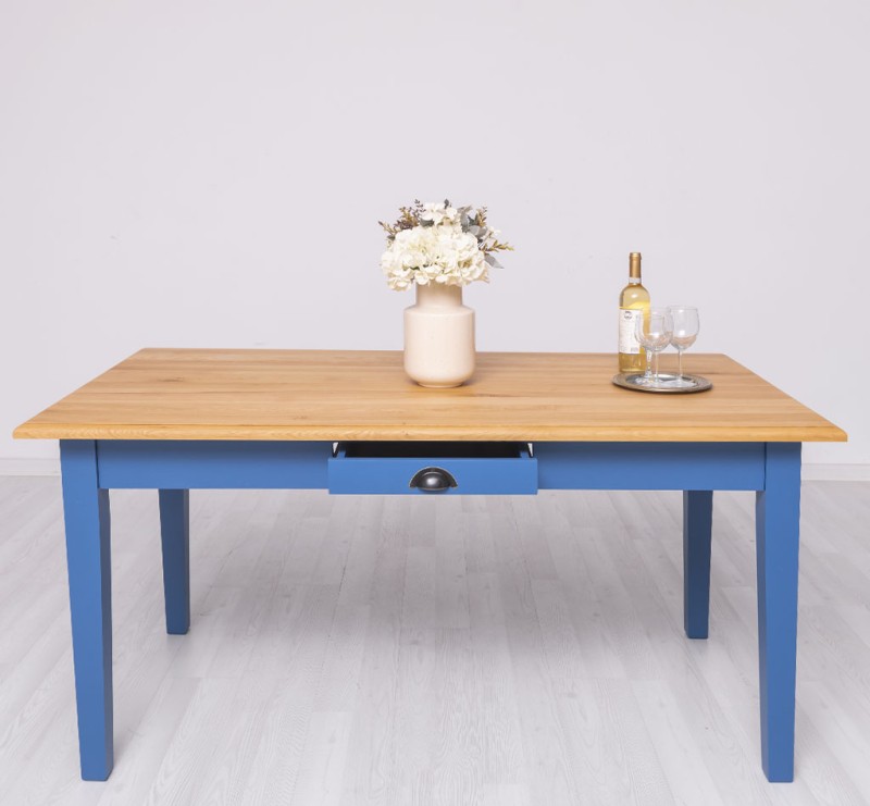 Der Esstisch im Landhausstil wird aus 100% massiven Holz gefertig. Eine Besonderheit ist die kleine Schublade zur Aufbewahrung kleiner Dinge.