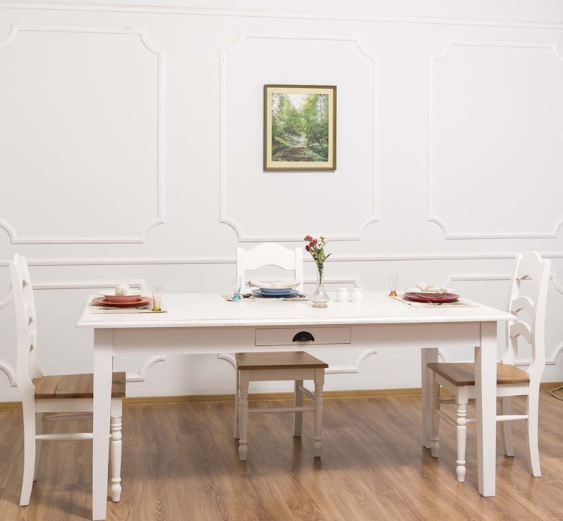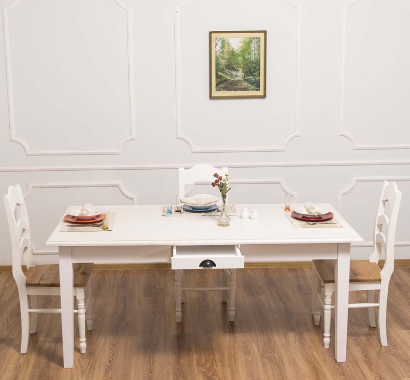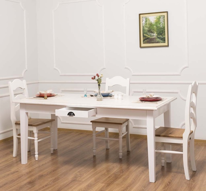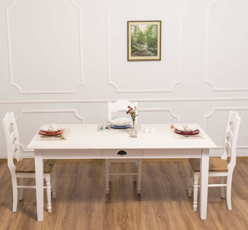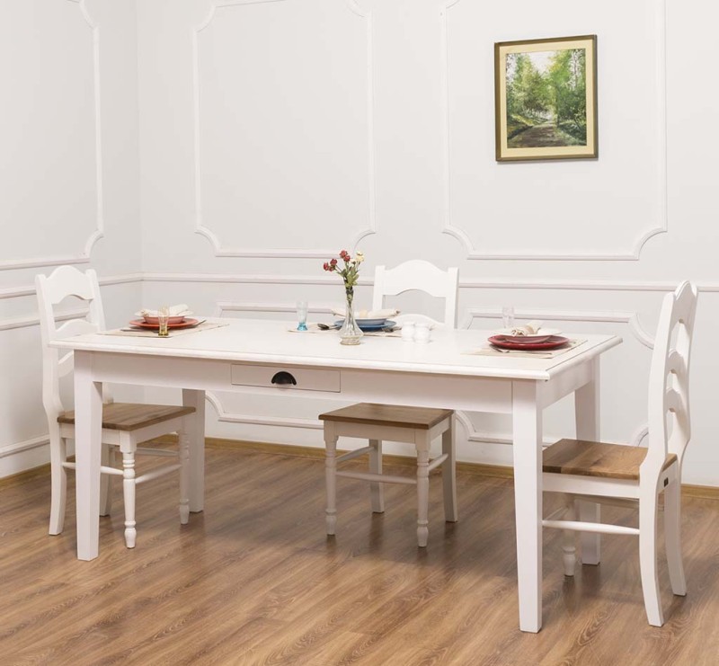 Der Esstisch im Landhausstil wird aus 100% massiven Holz gefertig. Eine Besonderheit ist die kleine Schublade zur Aufbewahrung kleiner Dinge.
