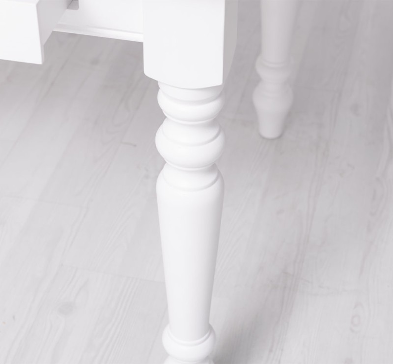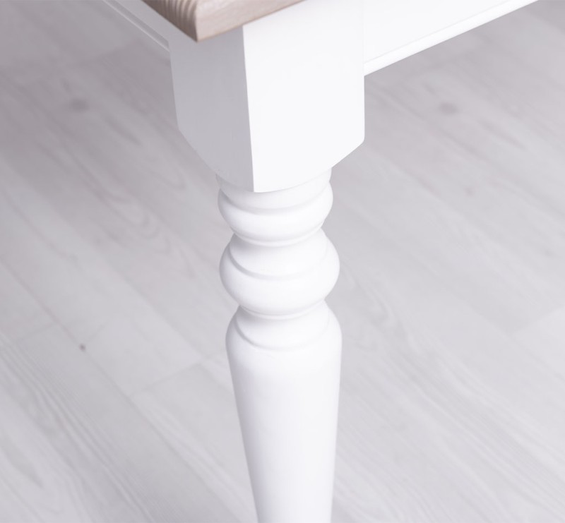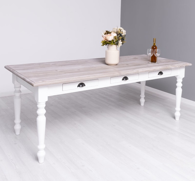 Der Esstisch im Landhausstil wird aus 100% massiven Kiefernholz gefertigt. Eine Besonderheit sind die drei kleinen Schubladen zur Aufbewahrung kleiner Dinge.
