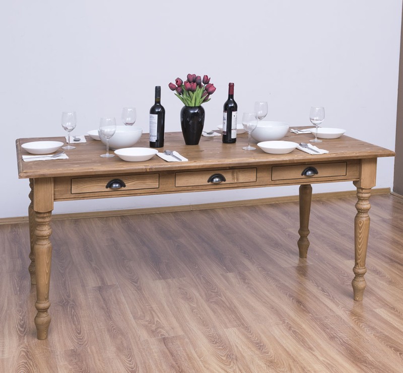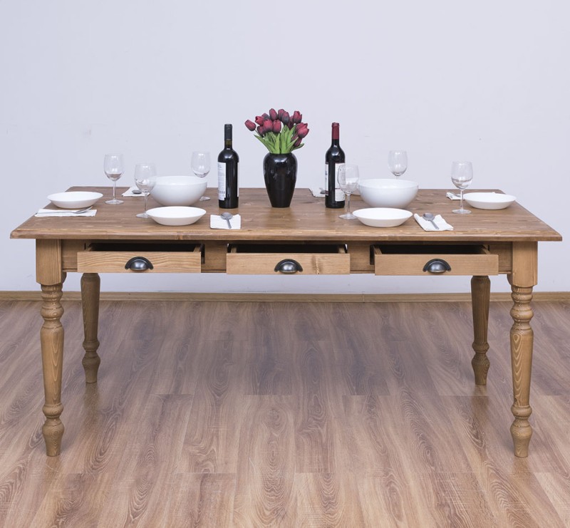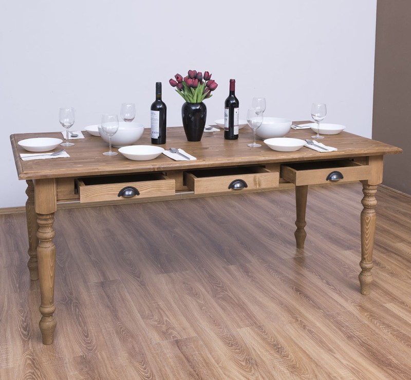 Der Esstisch im Landhausstil wird aus 100% massiven Kiefernholz gefertigt. Eine Besonderheit sind die drei kleinen Schubladen zur Aufbewahrung kleiner Dinge.