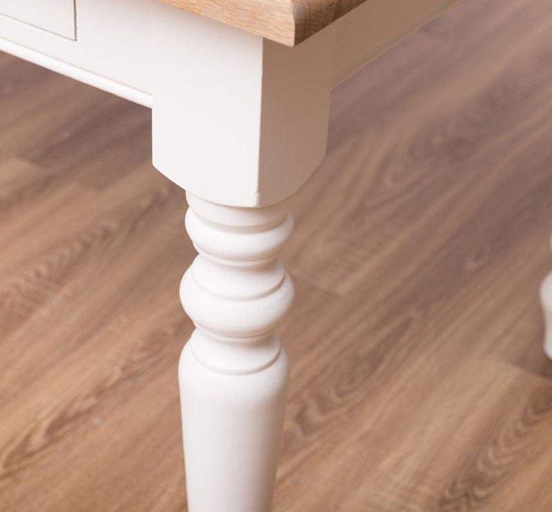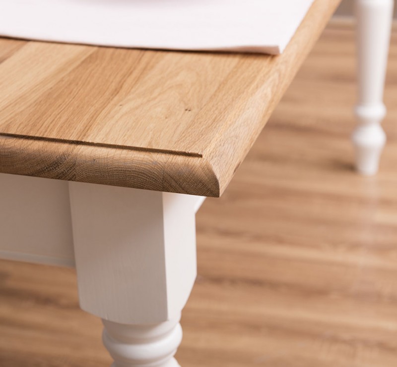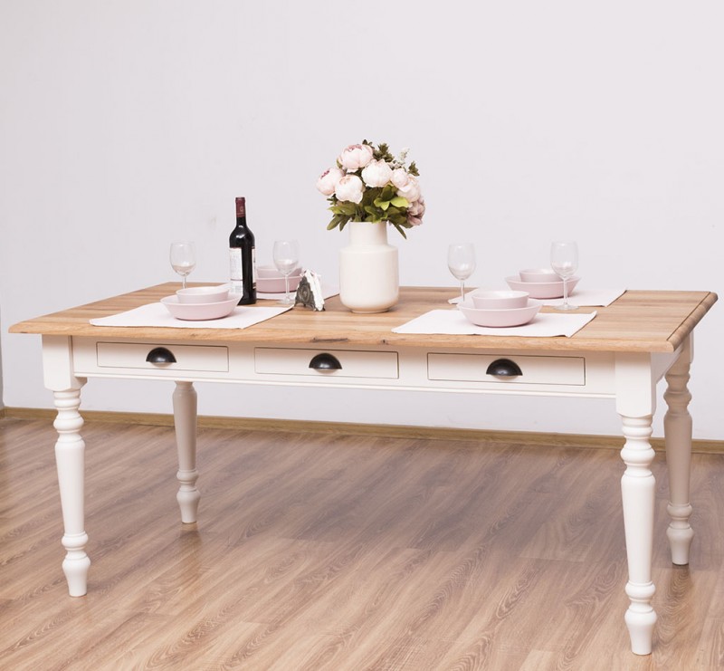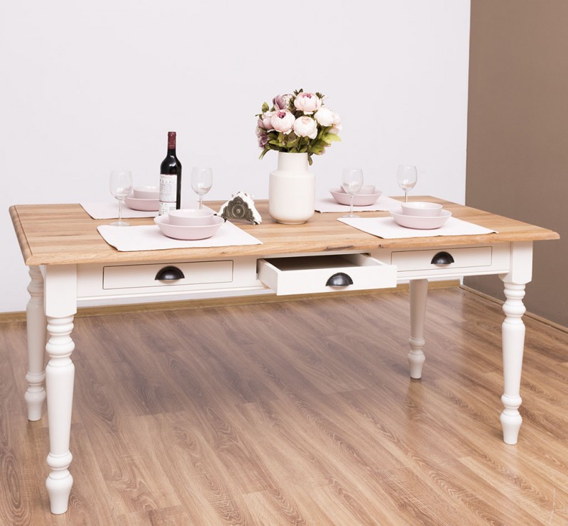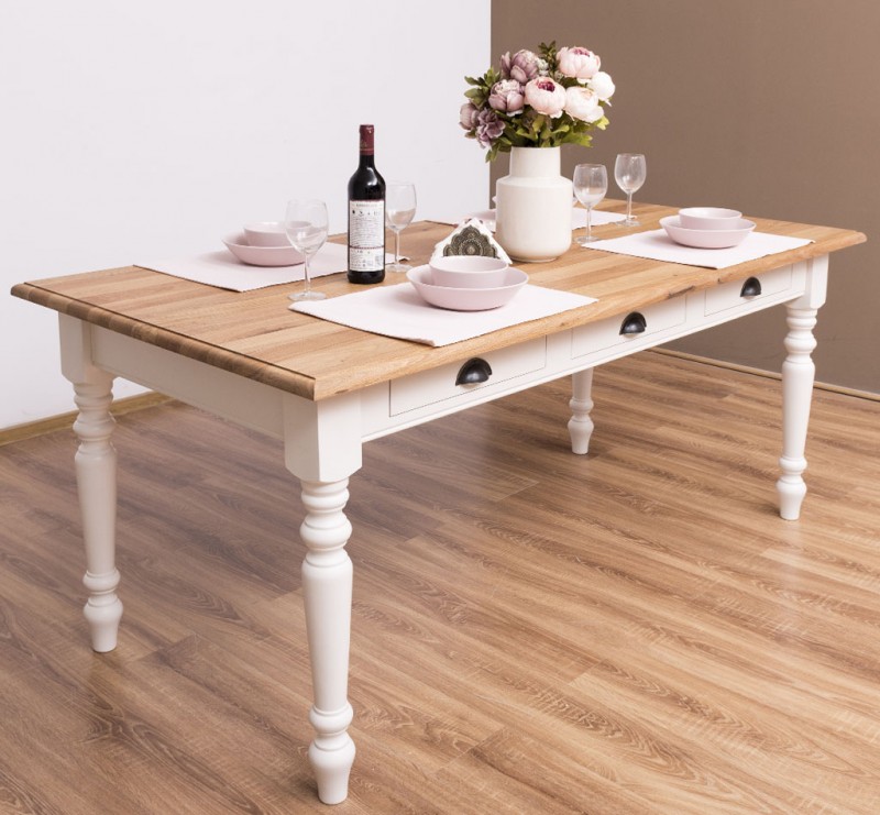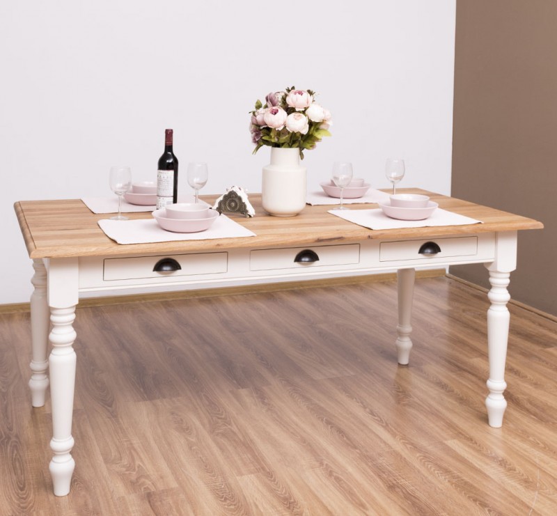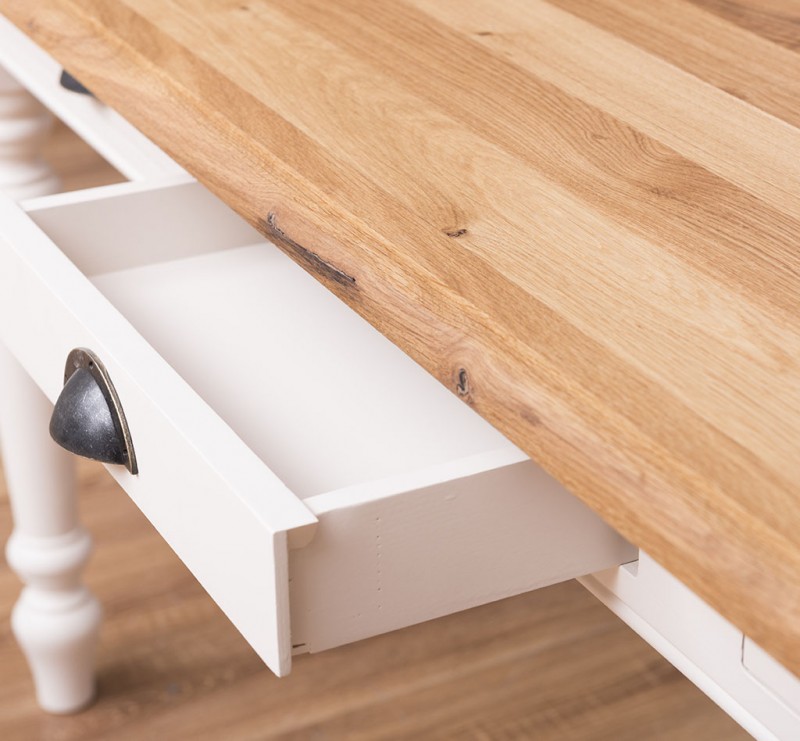 Der Esstisch im Landhausstil wird aus 100% massiven Holz gefertig. Eine Besonderheit sind die drei kleinen Schubladen zur Aufbewahrung kleiner Dinge.
