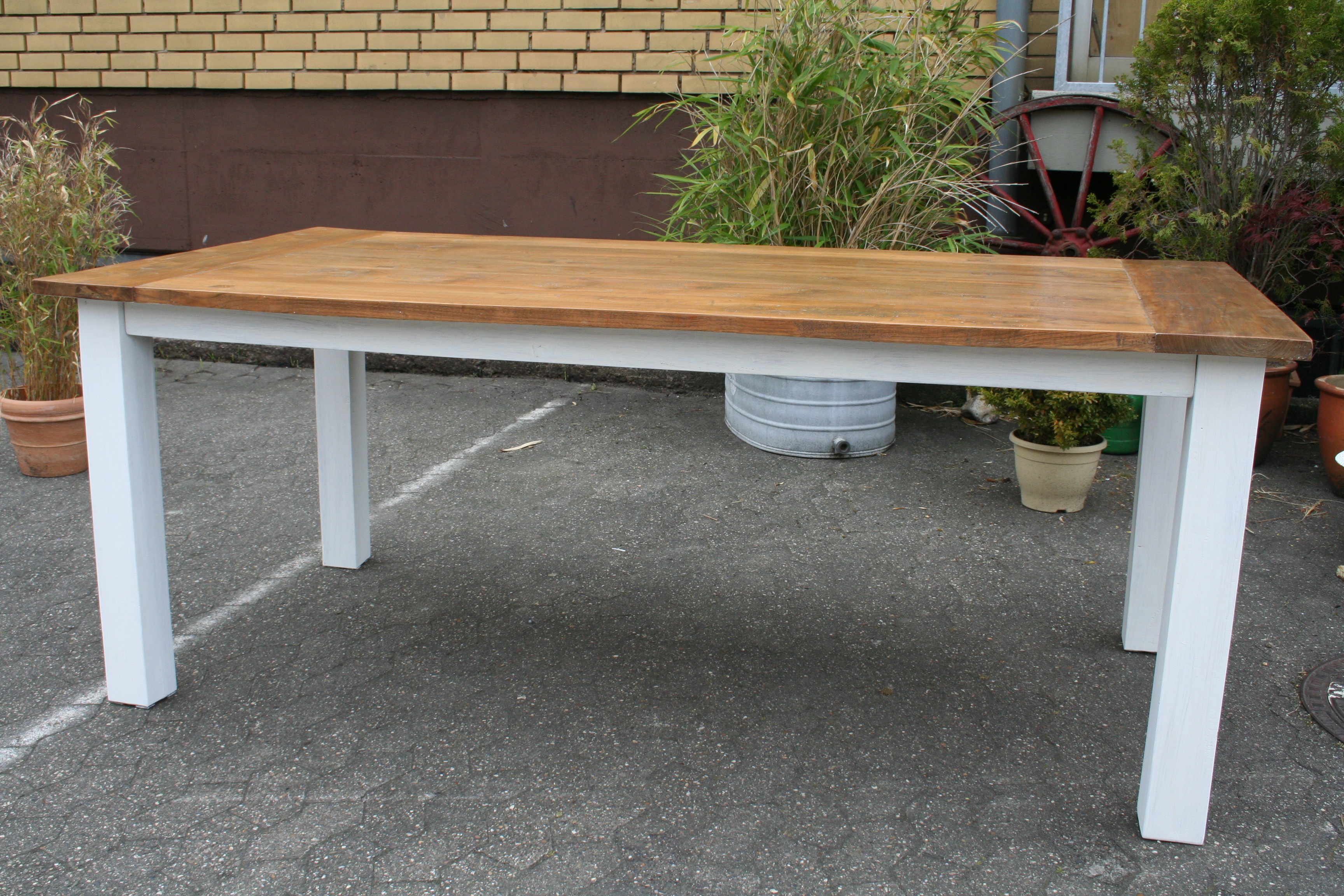 Der Esstisch Dengkleh ist ein hochwertiges Möbelstück im angesagten Vintage-Look. Die ausdruckstarken Block Beine und das Gestell wurden in weiß lackiert und sind im traditionellen Landhausstil gestaltet. Die massive Altholz Teak Platte und das naturbelassene Holz besticht mit seiner einzigartigen Maserung. Die Platte ist zusätzlich mit Naturwachs behandelt.