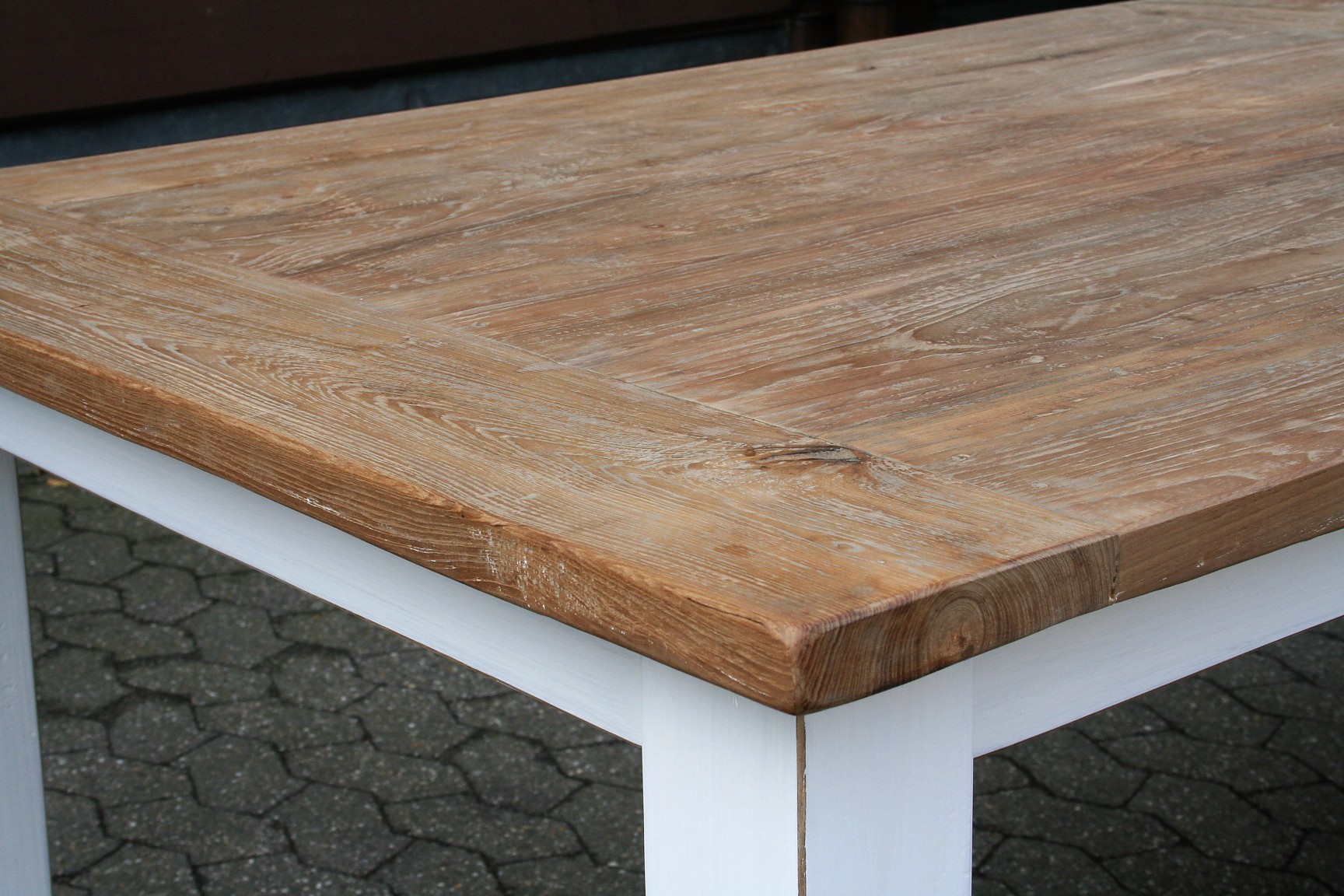 Die massiven Blockbeine sind 9 x 9 cm. Die alte Teakholz Platte besticht mit seiner einzigartigen Maserung. Jeder Tisch ist ein Unikat, an dem Sie lange Freude haben werden.