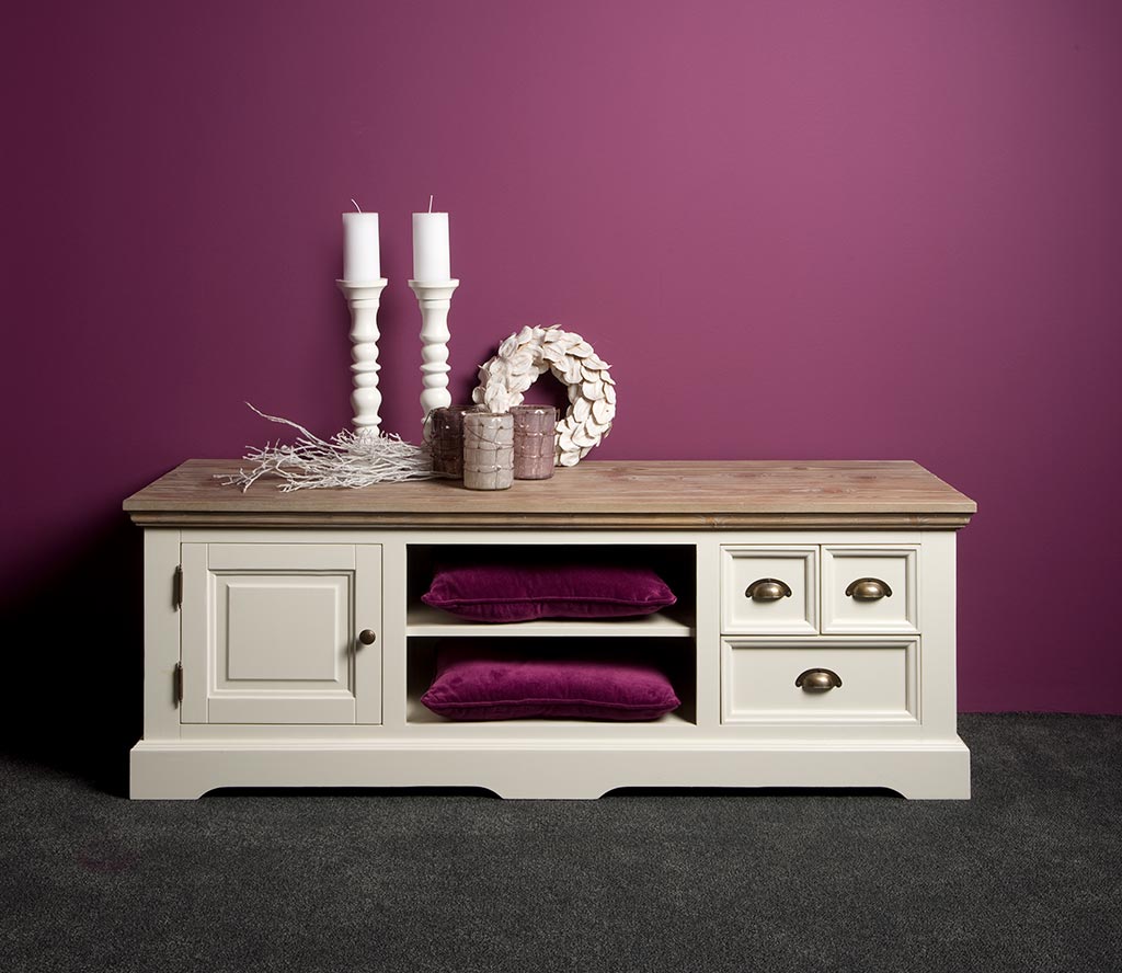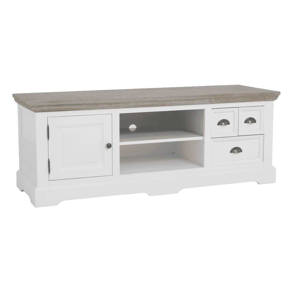 Der TV-Schrank Fleur 145 cm hat eine schöne graue Holzplatte, die diesen Möbeln einen romantischen und ländlichen Look verleiht! Der TV-Schrank hat eine Tür, drei Schubladen und zwei offene Fächer. Sehr praktisch, um alle möglichen Dinge aufzubewahren und Geräte in den offenen Fächern unterzubringen. Kombinieren Sie diesen Artikel mit den anderen Möbeln aus unserer Fleur-Kollektion!