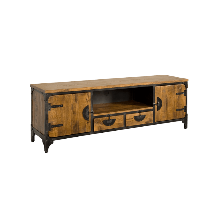 Ein tolles Lowboard aus Mangoholz und Eisen im Industrie-Look. Außen ist das Eisen mit dem natürlichem Charme des Mangoholzes sichtbar. Die Front ist im Vintage-Look gehalten. Dieses Möbelstück enthält zwei Schublade, zwei Türen und ein offenes Fach für Ihren Blu-Ray Player, Ihre Skybox oder die Spielkonsole.